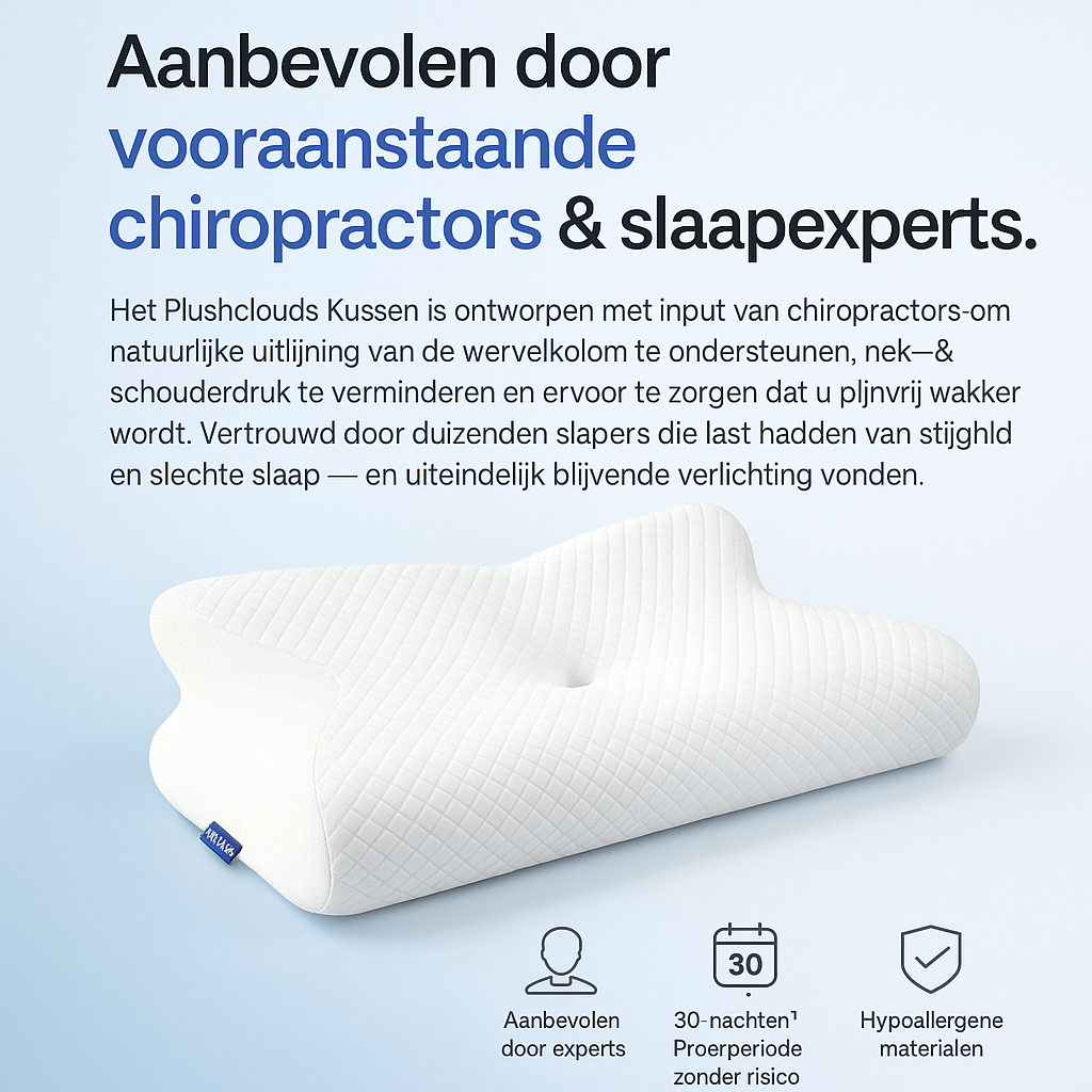 Het Plushclouds™ Kussen is ontwikkeld met input van chiropractors om de natuurlijke uitlijning van de wervelkolom te ondersteunen, druk op de nek en schouders te verminderen en u pijnvrij te laten ontwaken. Vertrouwd door duizenden slapers die last hadden van stijfheid en slechte nachtrust — en eindelijk blijvende verlichting vonden.