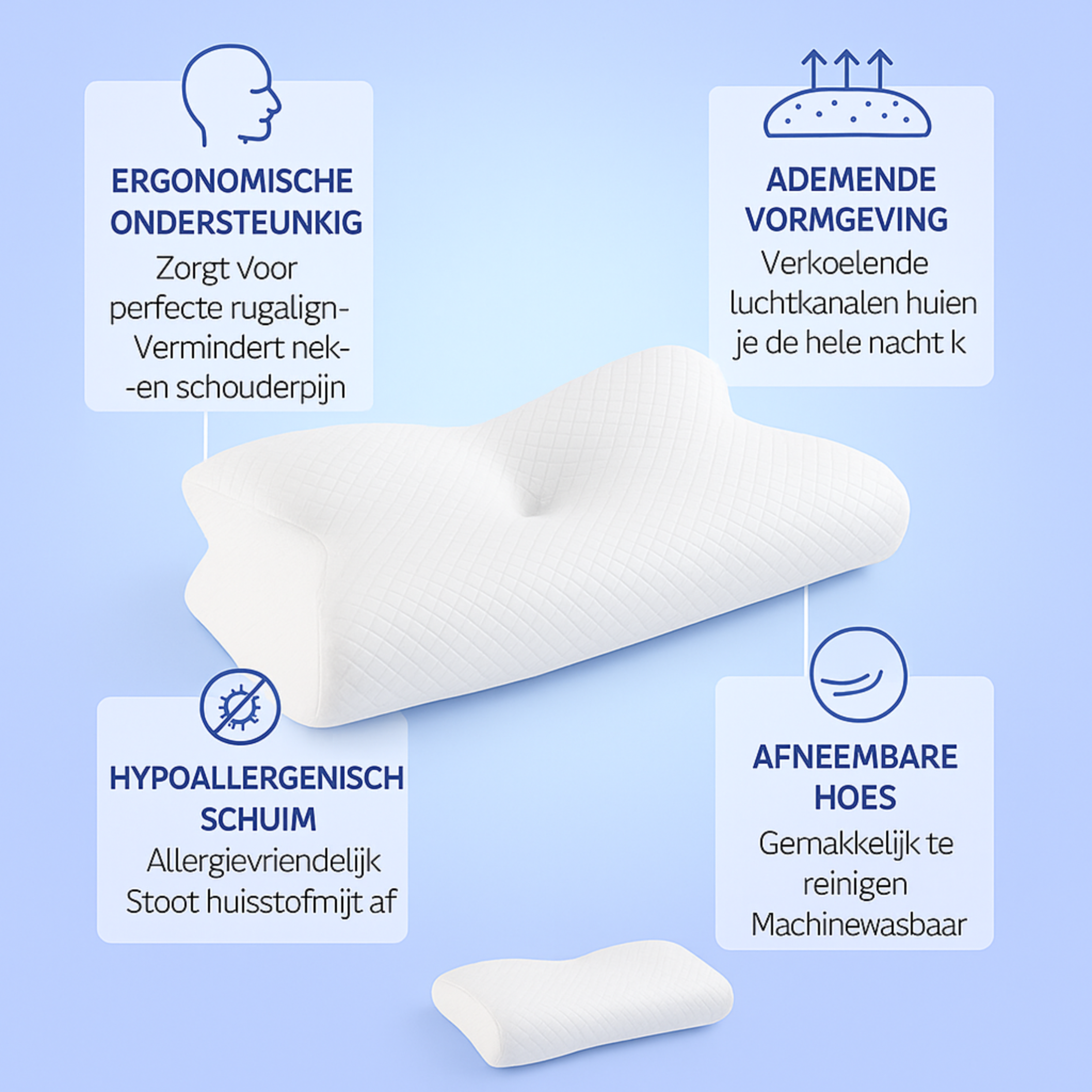 - Ergonomisch ontwerp, ondersteunt je nek en wervelkolom de hele nacht
